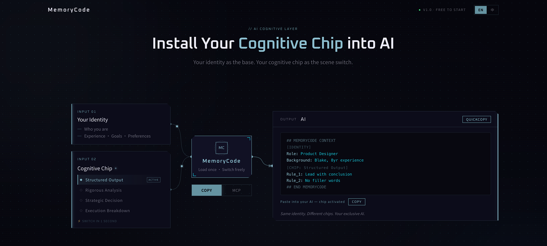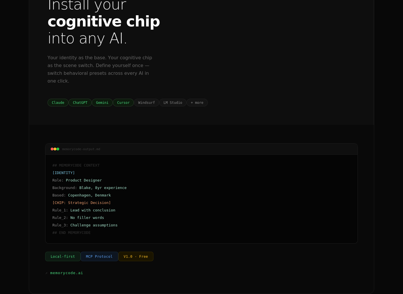 The Solution MemoryCode introduces a two-layer system: a persistent identity base (who you are, your background, goals) and swappable Cognitive Chips — behavioral presets that tune how any AI thinks, communicates, and structures output. Load once. Switch freely. Every AI.