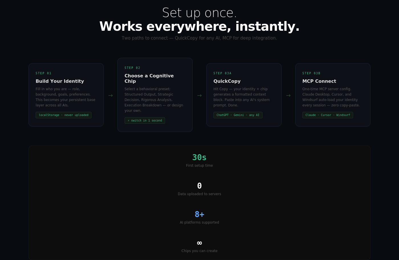 The Problem Every AI conversation starts from scratch. Power users waste hours re-establishing context, preferences, and working styles across Claude, ChatGPT, Cursor, and Gemini.