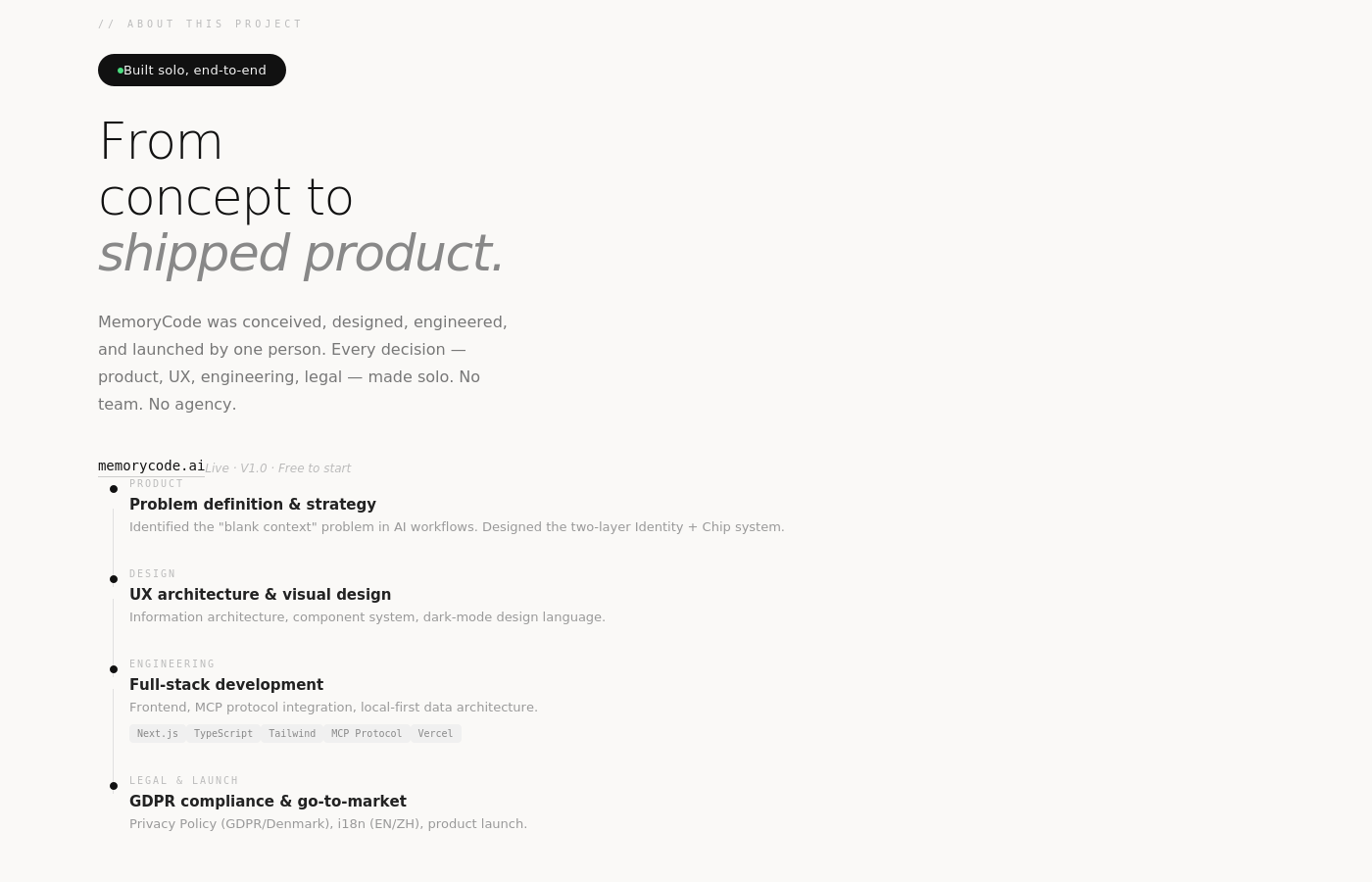 Built Solo, End-to-End This is a solo project in the fullest sense: product concept, UX architecture, UI design, React/Next.js frontend engineering, MCP server development, GDPR-compliant privacy infrastructure, and go-to-market strategy — all executed by one person. No team. No agency. Live at memorycode.ai.